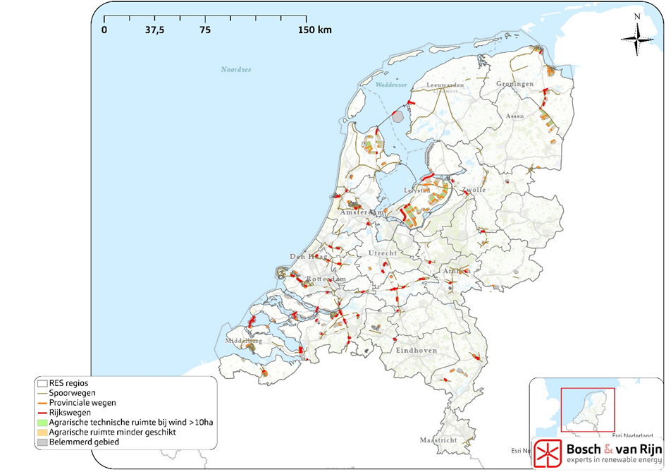 Vervolgens is gekeken naar de grootte van de (agrarische) gronden en geselecteerd op aaneengesloten gronden die uit ten minste 10 hectare bestaan en een maximale afstand van 150 meter tot de turbine hebben. Voor de landschappelijke inpassing is daarnaast nog geselecteerd op een maximale afstand van 250 meter tot hoofdinfrastructuur (spoorwegen, provinciale- en rijkswegen).