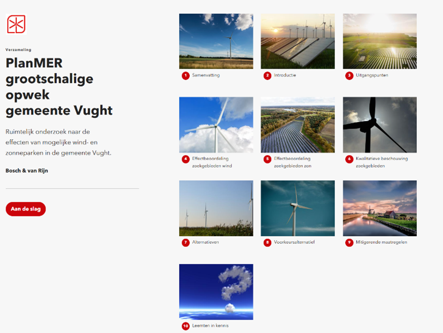 De commissie voor de milieueffectrapportage tevreden met het aangevulde digitale planMER zon en wind dat Bosch & van Rijn opstelde voor de gemeente Vught. In haar tussenadvies adviseerde de commissie mer op enkele punten een aanvulling. Het ging om de milieueffecten van het voorkeursalternatief, visualisaties en een analyse van de uitvoerbaarheid op het gebied van de nieuwe landelijke windturbinebepalingen, netcongestie en ecologie. De gemeente heeft deze adviezen overgenomen en door Bosch & van Rijn in het MER laten verwerken. Het planMER zorgt ervoor dat het milieubelang volwaardig wordt meegewogen in het zon- en windbeleid van de gemeente Vught.